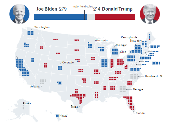 Cette élection se déroule au suffrage universel indirect : formellement, ce sont les 538 grands électeurs qui composent le collège électoral qui élisent le président. Pour être élu président, un candidat doit obtenir les votes d'au moins 270 d'entre eux. Selon des résultats encore provisoires, Joe Biden dispose de 279 voix, contre 214 pour le président sortant (les résultats ne sont pas encore connus pour l'Arizona, la Géorgie et la Caroline du Nord).