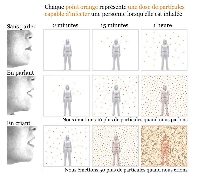 Pour informer le grand public de façon claire sur les conditions et le mécanisme de propagation du virus, le quotidien espagnol El País a créé une infographie très parlante. Cette dernière montre de manière explicite comment le coronavirus infecte une personne jusque-là non atteinte. Pour rappel, il se transmet par voie aérienne grâce aux microparticules qui flottent dans l'air. Et comme vous pouvez vous en douter, les risques augmentent grandement selon que l'individu infecté est silencieux, parle ou crie. En effet, ces critères changent le nombre de particules expulsées par la bouche mais également sa distance de projection. Le temps d'exposition à une personne malade joue également un rôle important dans la transmission de la Covid-19. À noter que les données des études utilisées pour réaliser le schéma ont été mesurées dans un lieu clos.