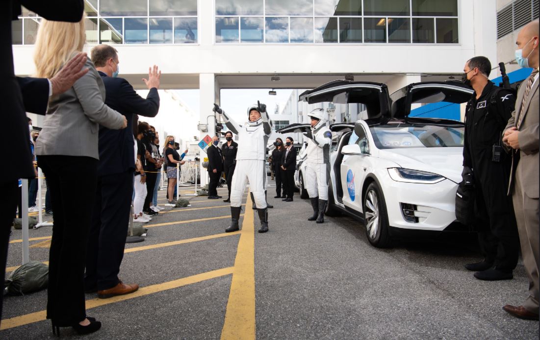 A 22h30, les trois teslas Model X se sont garées au pied de la tour d'accès à la capsule, laissant le temps aux quatre membres d'équipage de contempler leur fusée depuis le sol, avant de grimper à presque 60 mètres d'altitude. Un dernier appel (c'est une tradition) avant d'embarquer dans la capsule, et les voilà sanglés les uns après les autres, 2h30 avant leur décollage.