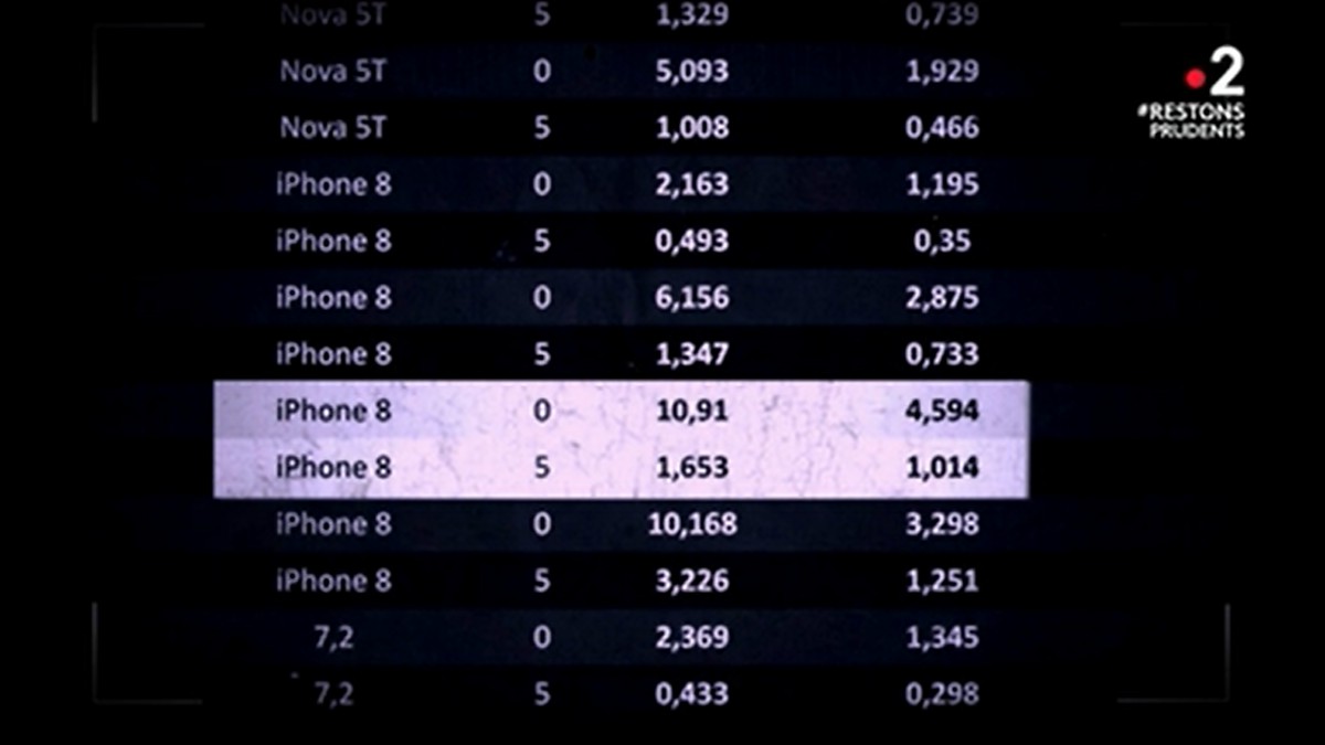 Plusieurs smartphones, parmi les plus vendus de ces dernières années, ont été mesurés par l'entreprise, à 5 mm puis à 0 mm. Si tous les téléphones testés présentent un DAS inférieur à la valeur réglementaire de 2 W/Kg pour le DAS tronc à 5 mm, tous sont au-dessus de la valeur 2W/Kg pour un DAS tronc à 0 mm, comme vous le voyez sur la capture d'écran ci-dessous. On grimpe par exemple de 1,01 W/Kg à 5 mm pour l'iPhone 8 à 4,59 W/Kg à 0 mm. Soit une exposition quatre fois supérieure, qui pose forcément question.
