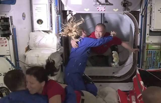 Rencontre entre les astronautes après l'arrimage de la capsule dragon de SpaceX à l'ISS.