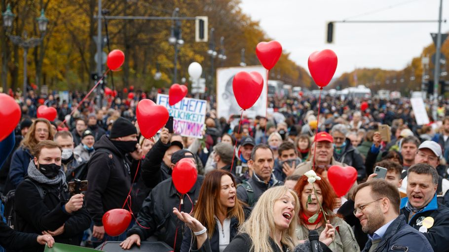 Dagmar s'est levée très tôt mercredi 18 novembre pour participer au rassemblement organisé à Berlin contre les mesures mise en place par le gouvernement pour endiguer l'épidémie de Covid-19 (le pays est partiellement reconfiné depuis le 2 novembre). La Bavaroise est montée à la capitale avec deux amies. Elles ont des ballons en forme de cœur qui volent au dessus de leur tête. Pacifistes, tous ces manifestants se disent souvent simples citoyens en colère. Pas question de leur accoler une quelconque étiquette politique. "Nous on veut renverser tout ça, dit Dagmar. Ils veulent nous imposer la dictature, ils veulent nous forcer, nous vacciner, nous prendre de l'argent, nous prendre tout ce que l'on a".