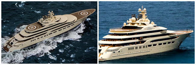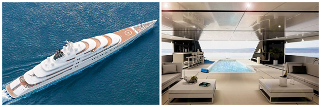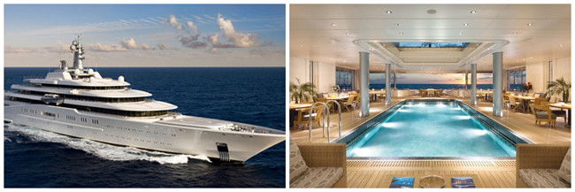 Eclipse, le méga yacht appartenant au milliardaire russe Roman Abramovich, déborde de luxe et de confort. Il a été lancé en 2009 et, malgré sa grande taille (167 mètres de long), il atteint 25 nœuds. Dans ses entrailles, il y a un héliport qui disparaît sous le pont en appuyant sur un bouton et dans ses cales, un hangar s'ouvrant sur la mer pour trois énormes bateaux. Il dispose également d'un sous-marin qui plonge à 50 mètres. Au sixième étage se trouve la chambre de 80 mètres carrés du magnat, avec des murs tapissés de peau de poisson galuchat et protégés par du verre blindé. Les chaises longues sont également recouvertes de peau de léopard et les tables, de crocodile.