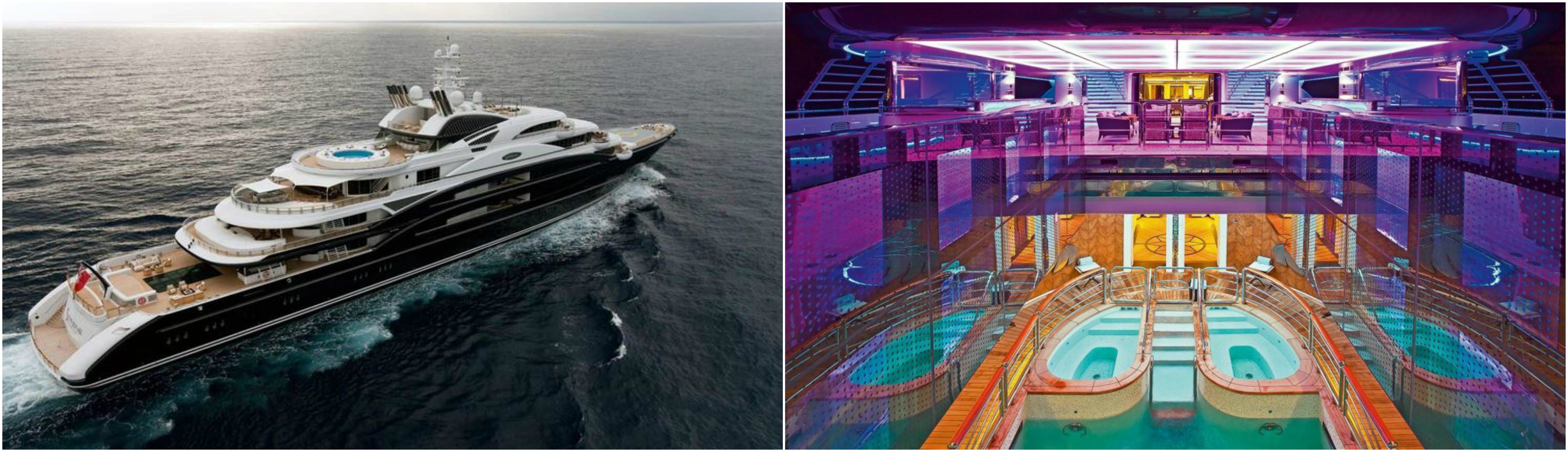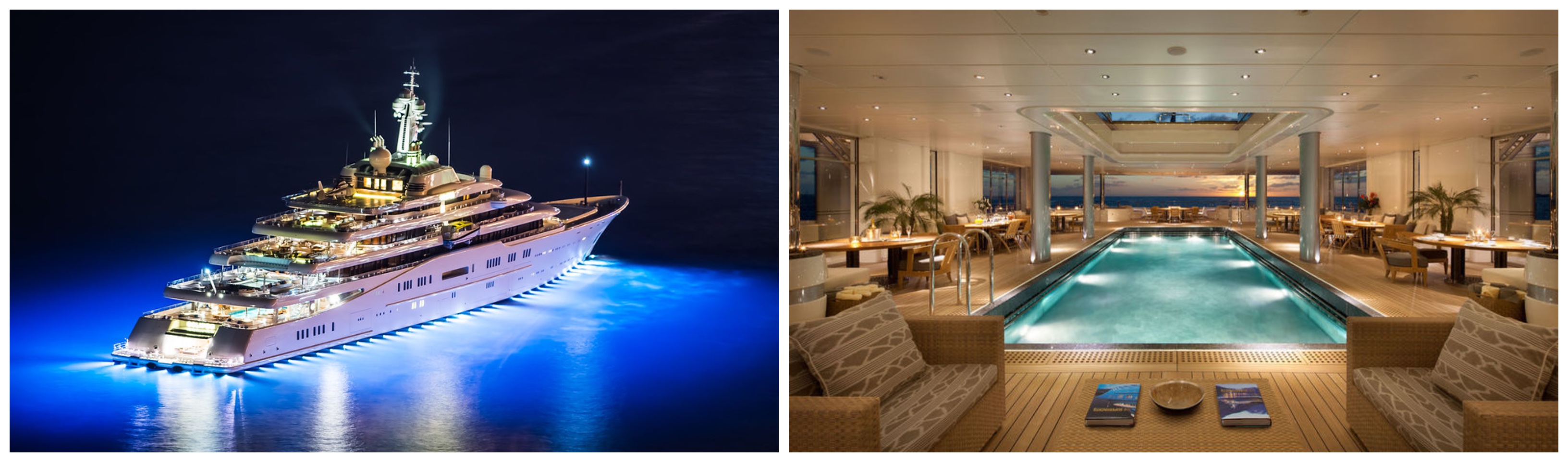 L'Eclipse a été construit par le chantier naval allemand Blohm + Voss avec une coque en acier et une superstructure en aluminium. Il a été créé en 2009 et son propriétaire actuel est le milliardaire russe Roman Abramovich. D'une longueur de 170 mètres, il nécessite 70 membres d'équipage pour le piloter et est équipé de stabilisateurs de vitesse zéro pour être plus à l'aise dans les eaux agitées. Il se compose de 18 suites d'hôtes, d'une suite principale avec un toit convertible pour profiter d'une nuit romantique en regardant les étoiles, de deux piscines, de plusieurs jacuzzis et d'une discothèque. Comme si cela ne suffisait pas, il est également équipé de trois autres canots et de deux héliports, ainsi que d'un sauna, d'un cinéma et d'un gymnase.