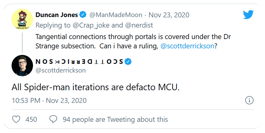 Les fans ont largement signalé l'erreur à Jones, qui a alors demandé confirmation à Derrickson. Scott Derrickson, a donc déclaré, le 23 novembre 2020 sur Twitter, que le GIF de Jones était tout à fait valable, puisque tous les films Spider-Man faisaient partie du MCU :