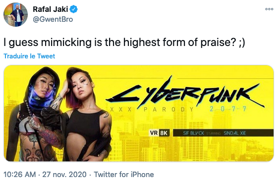 Ne dit-on pas que la parodie et l'imitation sont une forme de consécration ? C'est en tout cas ce que pense et a déclaré Rafal Jaki, directeur du développement commercial chez CD Projekt Red en découvrant que le titre du studio avait le droit à cette déclinaison pour adultes.