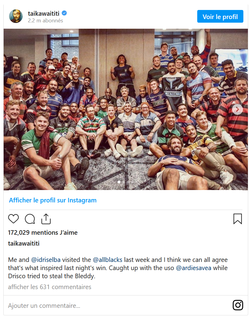 Idris Elba et moi avons rendu visite aux All Blacks la semaine dernière et je pense que nous pouvons tous convenir que c'est ce qui leur a inspiré la victoire d'hier soir. Nous avons rattrapé l'USA Ardie Savea pendant que Drisco essayait de voler le Bleddy.