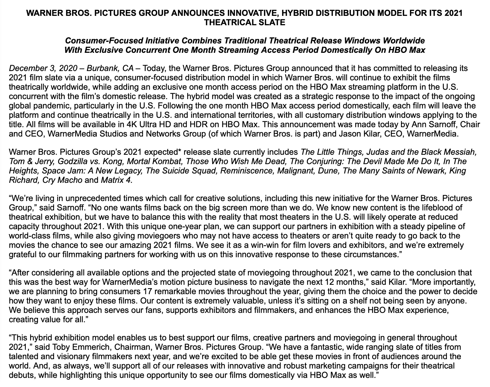 Aujourd'hui, le groupe Warner Bros. Pictures a annoncé que l'intégralité de leurs films prévus pour 2021 sortiront selon un modèle de consommation unique, axé sur le consommateur, consistant à sortir les films mondialement en salles, ainsi qu'en exclusivité, pendant une période d'un mois, sur la plateforme HBO Max.