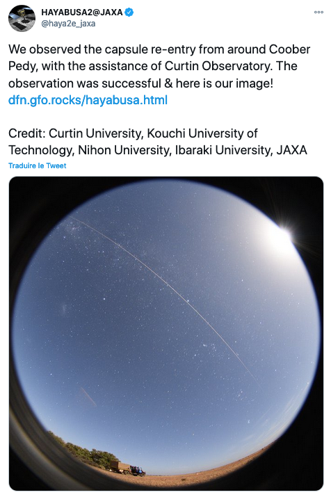 En effet, ce dimanche 6 décembre, le ciel de l'Australie a été traversé par une boule de feu. Il ne s'agissait pas d'une étoile filante, mais d'une capsule japonaise rentrant dans l'atmosphère terrestre après s'être détachée de la capsule nippone Hayabusa-2. A l'intérieur, une centaine de milligrammes de poussière d'astéroïde prélevée sur Ryugu, un objet céleste situé à quelque 300 millions de kilomètres de chez nous.