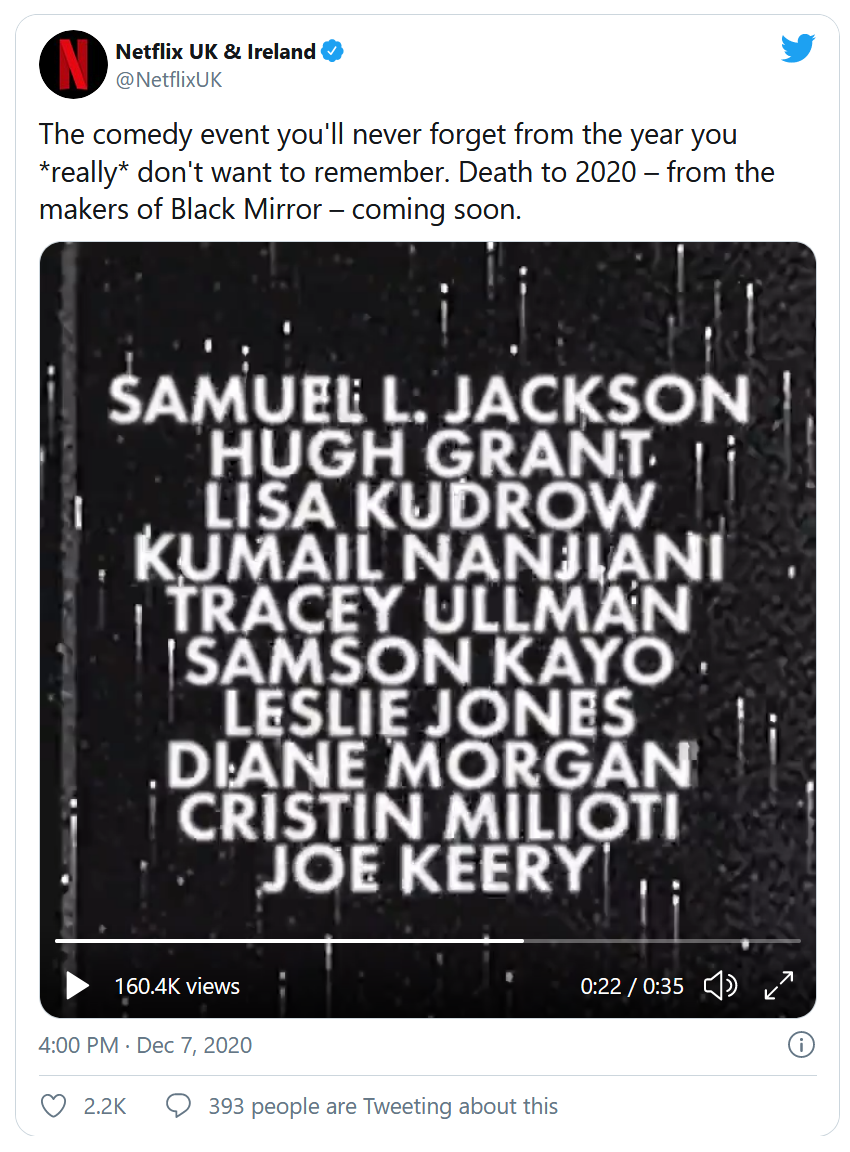 Si vous êtes l'une des nombreuses personnes qui a maudit l'année 2020 plus de fois que vous ne pourriez le compter, Netflix vous a entendu. Le géant du streaming vient en effet d'annoncer la parution sur sa plateforme de Death to 2020, un "événement comique" tout droit sorti de l'esprit des créateurs de Black Mirror, qui devrait nous permettre d'enterrer définitivement 2020.