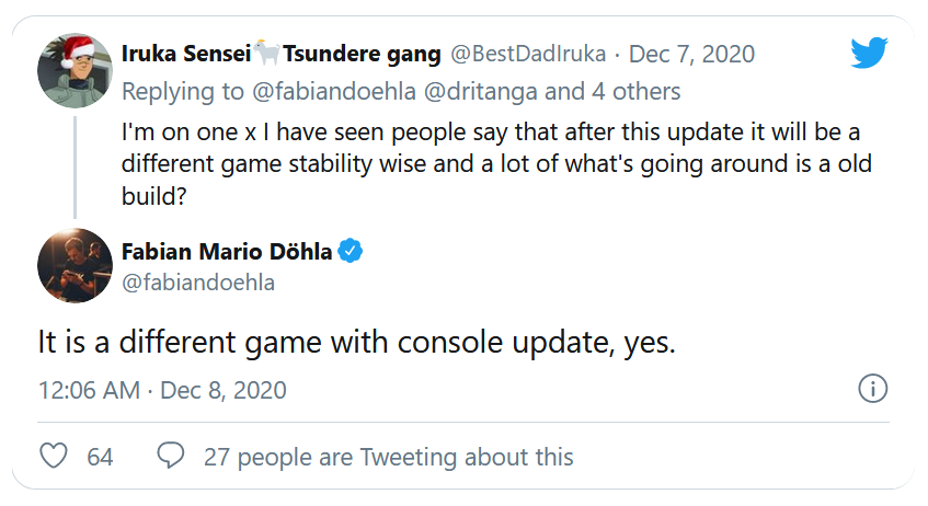 En quête d'informations, nombreux ont été les internautes à prendre la direction de Twitter pour glaner des informations sur Cyberpunk 2077. Et malgré les publications des tests des sites spécialisés, aucun gameplay PS4 et Xbox One n'a été partagé. La raison ? Un manque d'optimisation sans doute, le studio polonais cherchant à mettre en valeur sa version la plus travaillée, celle sur PC. Intéressé, un internaute à questionner Fabian Mario Döhla de chez CD Projekt RED vis à vis de ces versions consoles. L'occasion pour Döhla de confirmer que le patch Day One fera de ses versions PS4 et Xbox One un nouveau jeu.