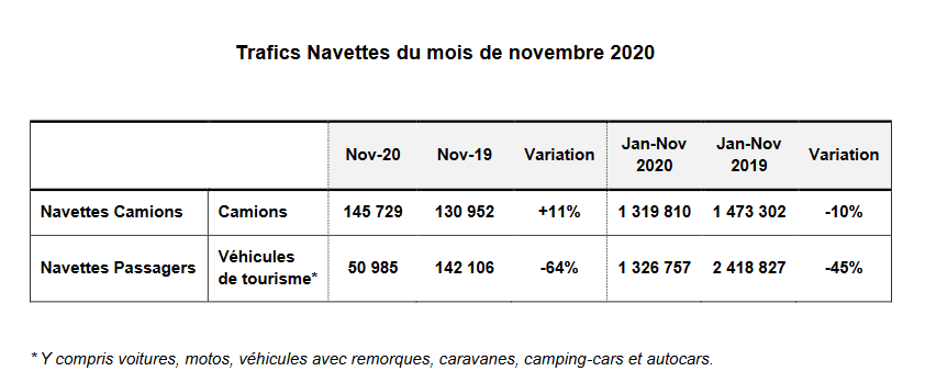 Le trafic trans-Manche via navettes Eurotunnel en novembre 2020 :