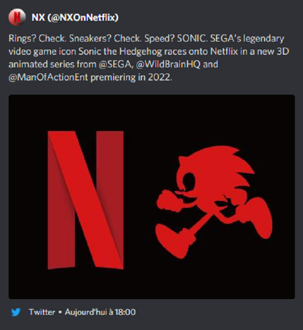 Et tout porte à croire que Netflix est bien décidé à ne pas s'arrêter là. En effet, la plateforme serait en train de plancher sur une série d'animation 3D centrée autour de Sonic le Hérisson, le personnage de jeux vidéo créé par SEGA. L'information nous vient de la page Twitter NX on Netflix, l'une des pages officielles du SVOD. Cependant, la publication a rapidement été supprimée, sans doute pour faire correspondre la nouvelle avec les Game Awards qui auront lieu cette nuit.