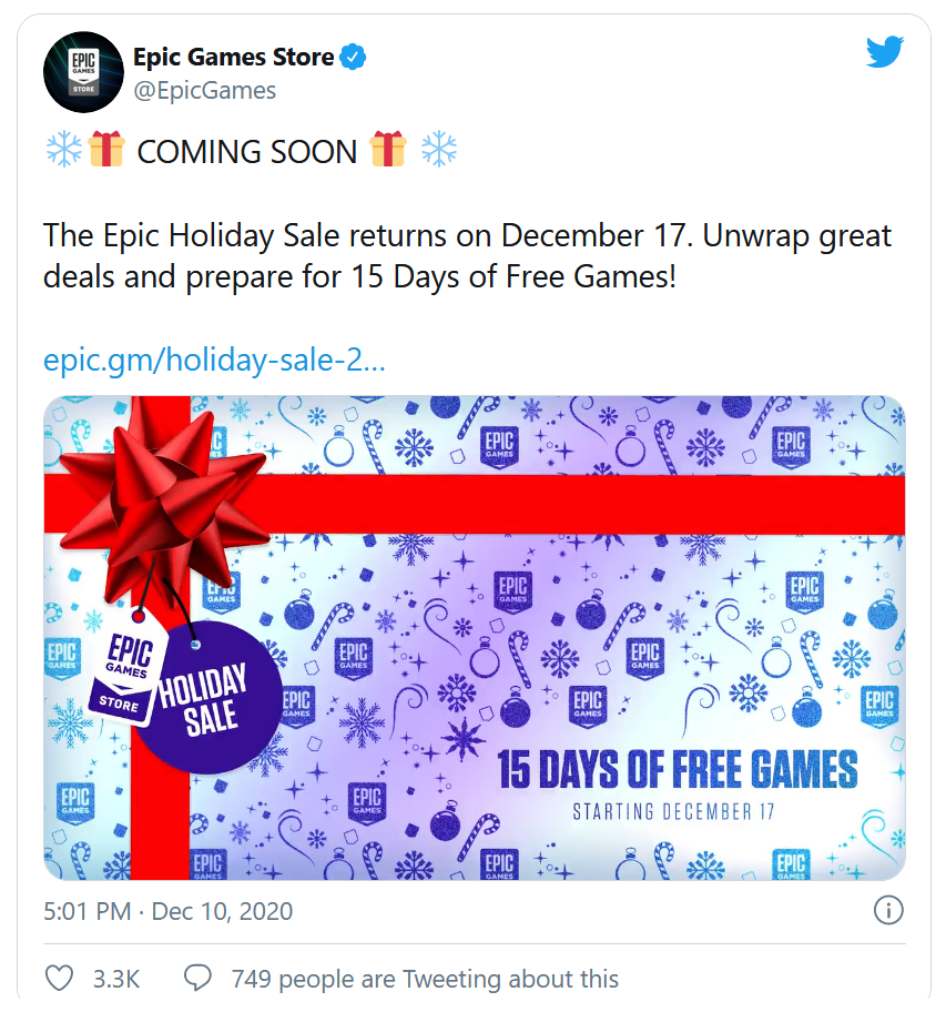 L'année dernière, l'Epic Games Store avait également offert des coupons de 10 dollars pour vous aider à acheter le jeu de votre choix. Cependant, aucune information n'a été communiquée pour un éventuel retour de ce genre de coupon, il ne va donc sûrement pas falloir compter là-dessus cette année 2020.
