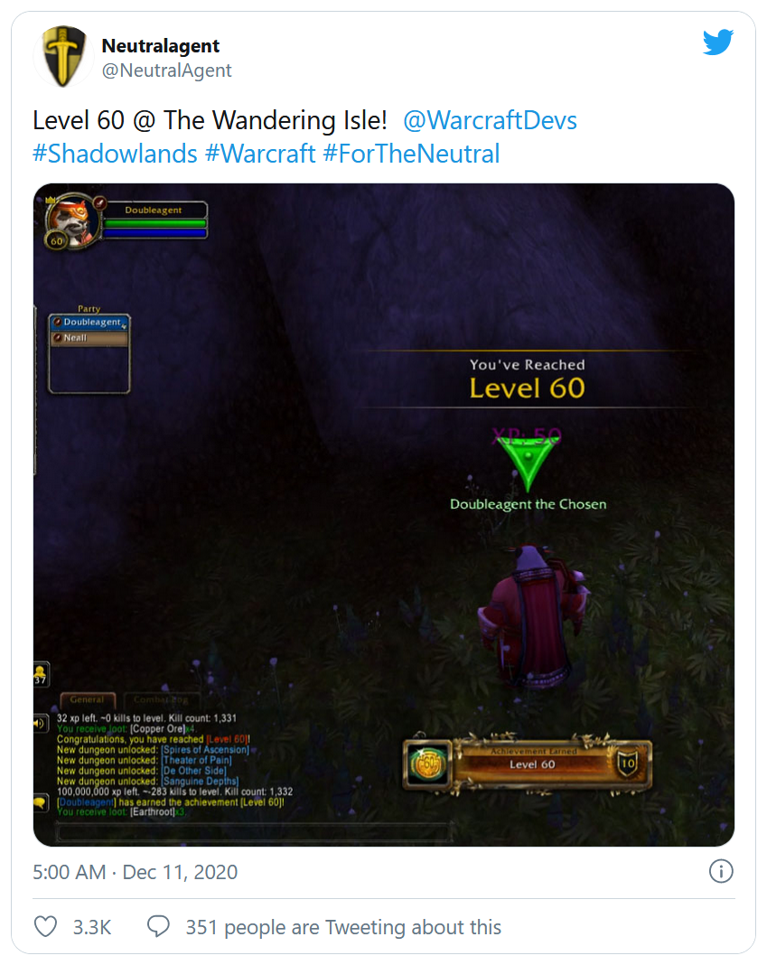 Naturellement, cette façon de jouer nécessite de nombreuses heures de jeu pour pouvoir XP. Patient et déterminé, Doubleagent est cependant parvenu au plus haut niveau de Shadowlands, la nouvelle extension de World of Warcraft, en seulement 17 jours. Un record impressionnant.