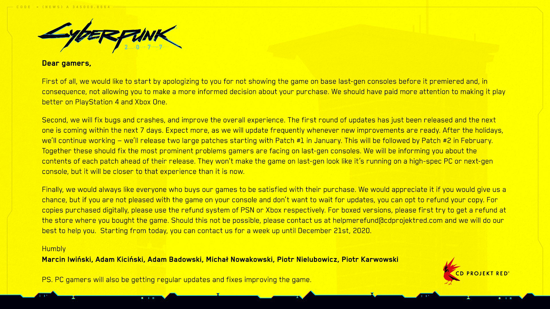 A travers un long communiqué publié directement sur le compte Twitter officiel de Cyberpunk 2077, CD Projekt Red annonçait que les versions dématérialisées et physiques PS4 et Xbox One seraient remboursées. Le studio invitait alors les joueurs à se rapprocher de Sony pour les achats effectués sur le PlayStation Store, quand Microsoft doit assurer la partie Microsoft Store. Pour les versions physiques, les joueurs intéressés doivent tenter d'obtenir un remboursement auprès du revendeur concerné.