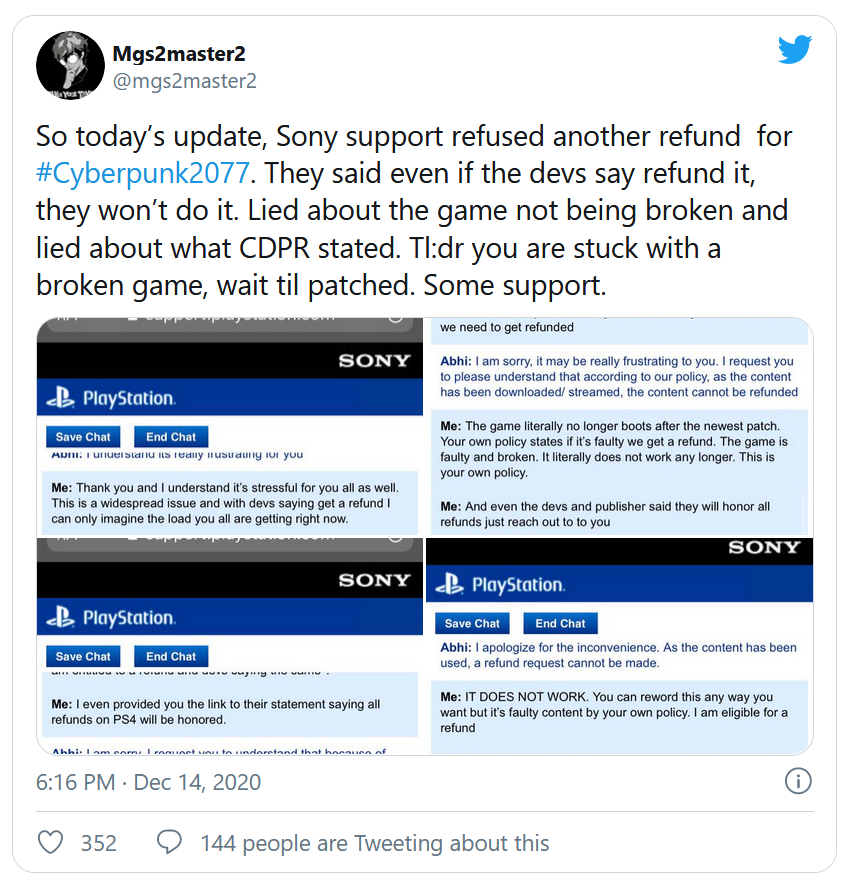 Problème, cette promesse n'est pas suffisante pour obtenir un remboursement auprès de Sony. Les conditions de remboursement sont claires, seul Sony est décisionnaire dans ce genre de situation, que CD Projekt Red soit d'accord ou non n'apporte rien. Sur le forum Reset Era, un thread a été créé pour compiler les refus de remboursement de la part de Sony. De nombreux internautes font alors état d'un refus catégorique des employés de Sony expliquant que, puisque l'éditeur ne s'est pas officiellement exprimé sur le sujet, aucun remboursement n'est possible.