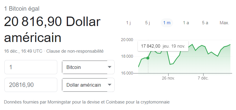 Cependant, ces jours sombres semblent oubliés, puisque le bitcoin vient, pour la première fois de son Histoire, de dépasser la barre symbolique des 20 000 dollars. 1 Bitcoin vaut très exactement, à l'heure où nous écrivons ces lignes : 20 816,90 dollars, soit 17 100,01 euros.