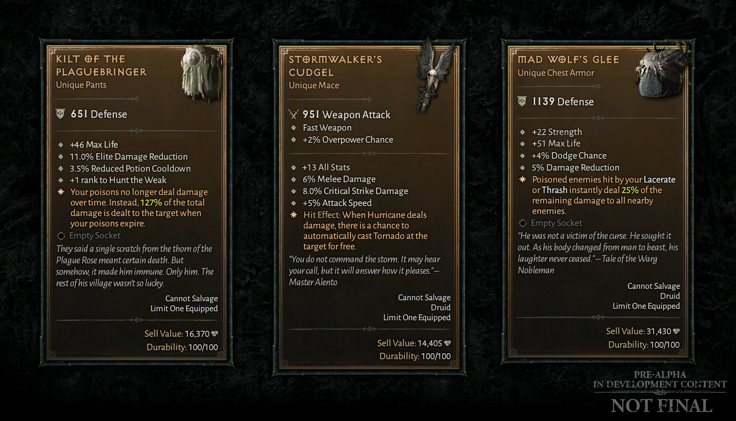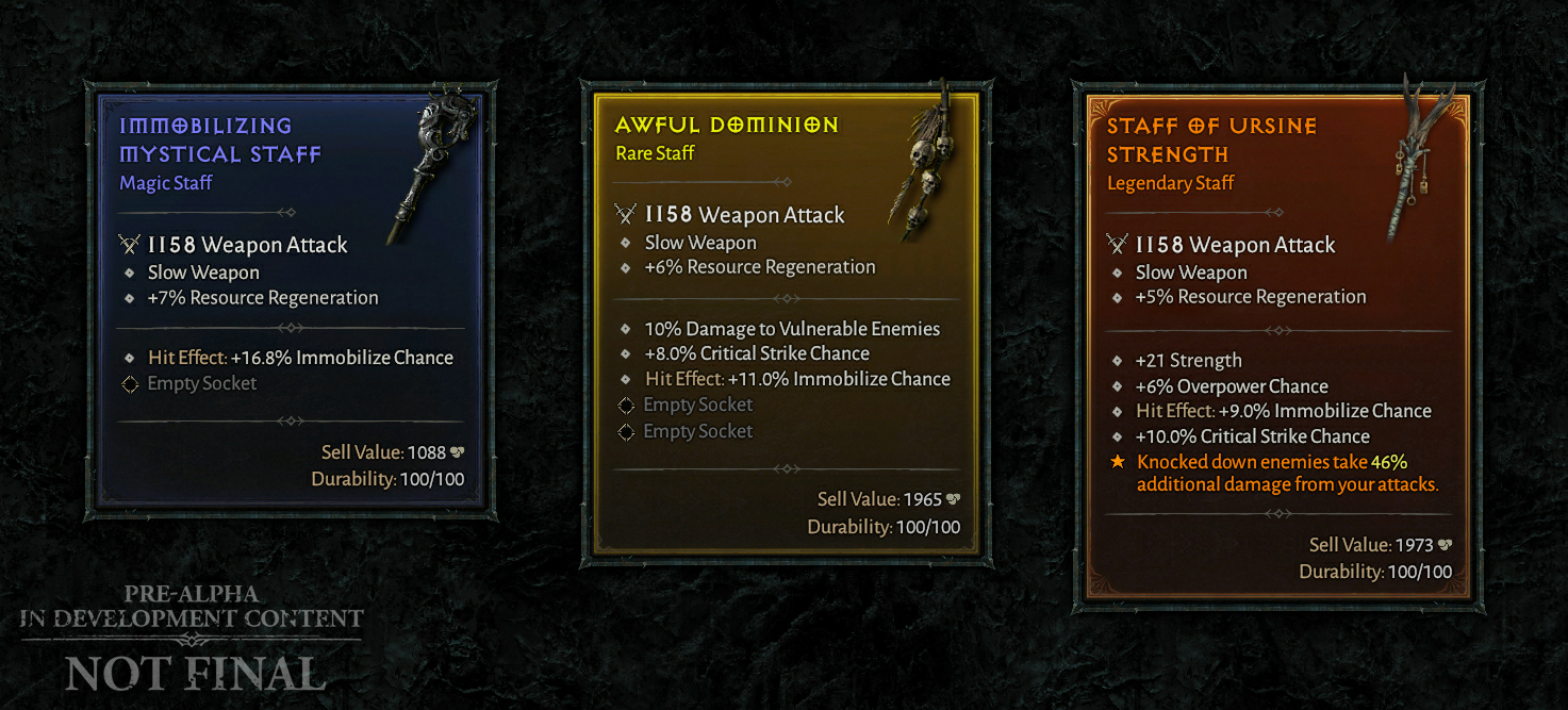Récupérés sur les ennemis, les équipements permettent d'augmenter les statistiques des personnages tout en offrant certains avantages passifs très puissants pour les pièces les plus recherchées. Plus l'objet est rare, plus ce dernier est supposé être puissant. Et dans Diablo IV, les objets évoluent par rapport à l'opus précédent. Ainsi, les objets magiques (bleus) auront des affixes plus intéressants, quand le nombre d'affixes des objets rares (jaunes) a été augmenté.