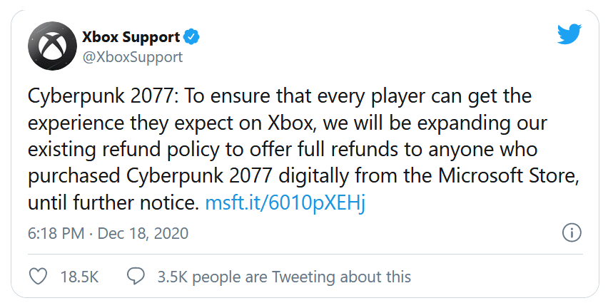 We know the developers at CD Projekt Red have worked hard to ship Cyberpunk in extremely challenging circumstances. However, we also realize that some players have been unhappy with the current experience on older consoles. To date, we have granted refunds to the vast majority of customers who have requested one. To ensure that every player is able to get the experience they expect on Xbox, we will be expanding our existing refund policy to offer full refunds to anyone who purchased Cyberpunk 2077 digitally from the Microsoft Store, until further notice.