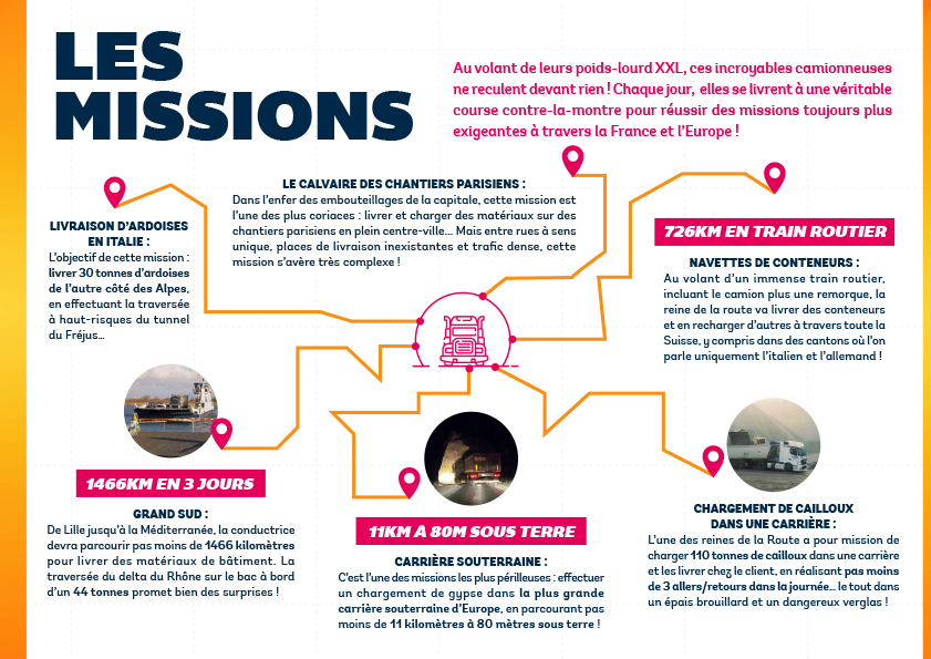 Sept femmes passionnées par leur métier de conductrice poids lourd vont partager leur quotidien sur les routes de France et d'Europe. Malgré des missions accomplies dans des conditions souvent difficiles, rien n'arrête Lexie, Sarah, Jennifer, Chrystelle, Emilie, Diane et Maïlys, qui ne renoncent jamais à leur féminité mais brisent les codes pour vivre leur amour du camion. Elles parcourent des centaines de kilomètres au volant de leurs camions de 44 tonnes. Plus qu'une passion, ce métier de routière est une vocation.
