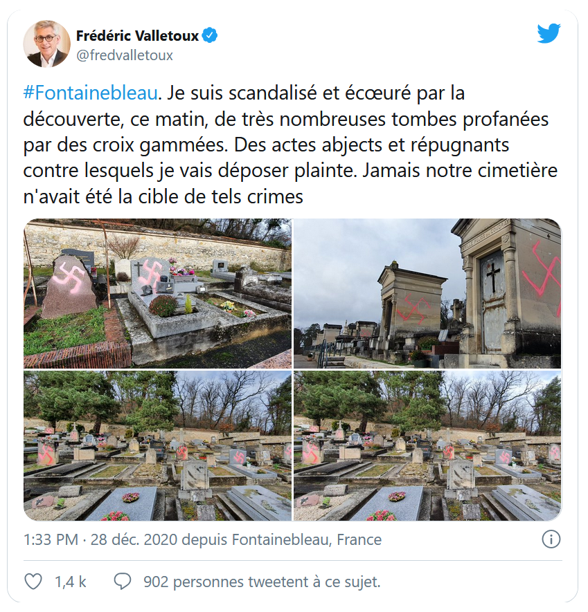 Des croix gammées ont été tracées sur de nombreuses tombes du cimetière de Fontainebleau, en Seine-et-Marne, indique lundi 28 décembre le maire Frédéric Valletoux sur son compte Twitter. Il va porter plainte. Le cimetière juif, situé à côté du cimetière principal de la ville, n'a pas été profané, selon le parquet de Fontainebleau, qui a ouvert une enquête pour "dégradation de sépultures".