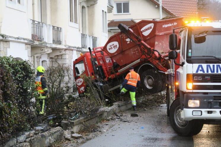 Après avoir traversé la voie de circulation opposée et défoncé une barrière métallique longeant une haie paysagère, le camion-benne a terminé son embardée au pied de la façade de l'ancien hôtel Beau Rivage.
