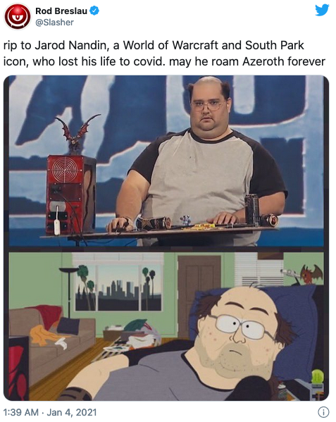 "RIP Jarod Nandin, une icône de World of Warcraft et de South Park, qui a perdu la vie à cause du covid. qu'il puisse errer en Azeroth pour toujours."