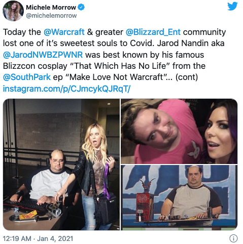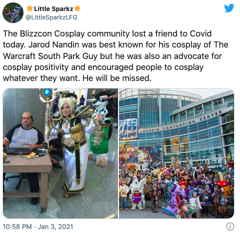 "La communauté du Blizzcon Cosplay a perdu un ami à cause du Covid aujourd'hui. Jarod Nandin était surtout connu pour son cosplay de The Warcraft South Park Guy, mais il était aussi un défenseur du cosplay positif et encourageait les gens à cosplayer ce qu'ils voulaient. Il nous manquera."