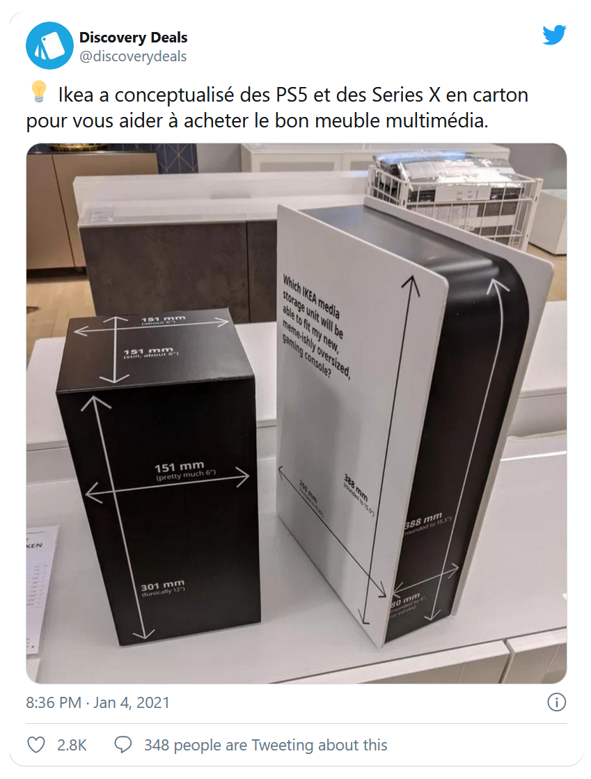 Face aux dimensions hors du commun des consoles nouvelle génération, l'enseigne met donc les bouchées doubles, et propose ces PS5 made in Ikea qui amusent beaucoup les visiteurs. On peut d'ailleurs lire sur les consoles cartonnées l'inscription suivante : "Quel meuble de stockage de médias sera capable d'accueillir ma nouvelle et beaucoup trop grande console de jeux ?". À chaque problème sa solution, et tant mieux si cette dernière comporte une touche d'humour. Alors, trouverez-vous le meuble parfait pour que votre PS5 soit bien visible par tous vos visiteurs ? Ikea l'espère bien.