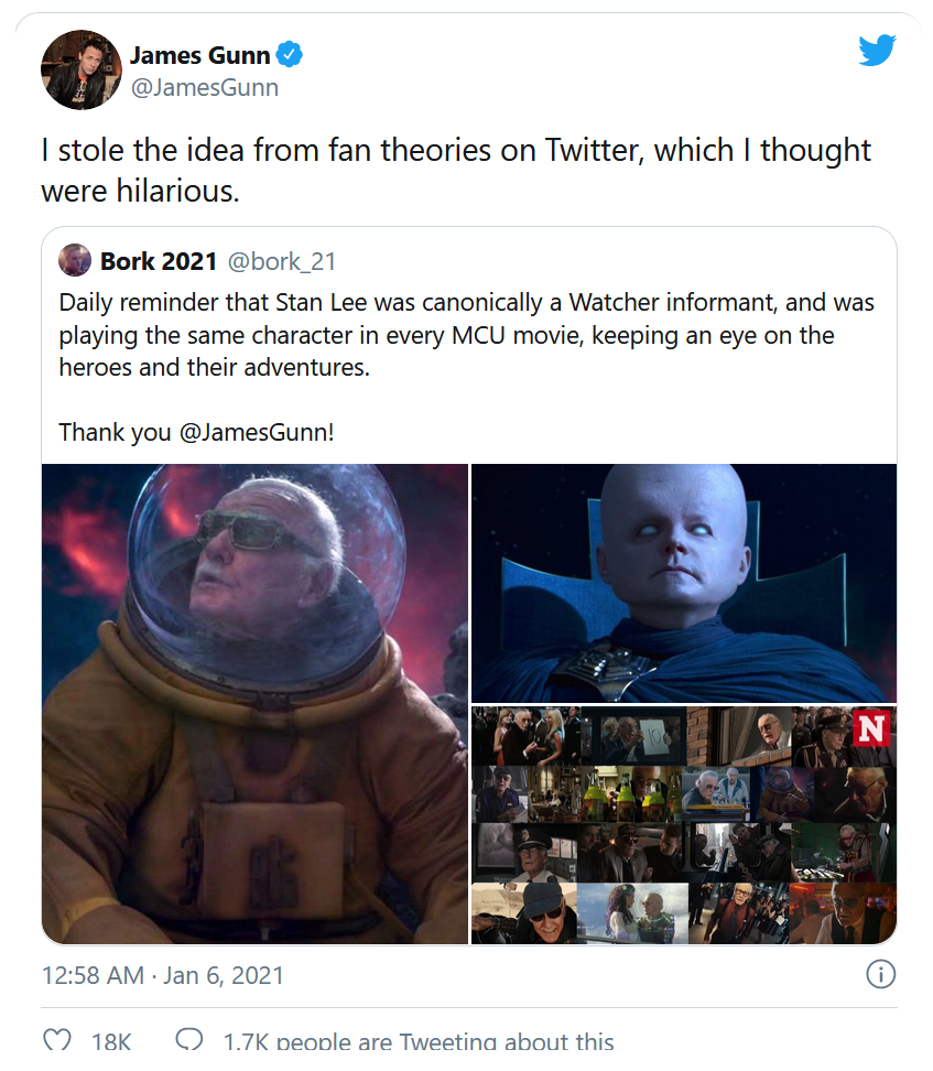 Même si cette théorie n'engage que James Gunn, celle-ci pourrait largement tenir la route. Elle expliquerait alors toutes les apparitions de Stan Lee dans les nombreuses productions des studios Marvel.