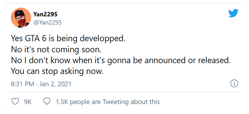 La source est Yan2995. Un ancien insider des studios Rockstar Games. C'est à lui que l'on doit certaines des fuites les plus importantes sur le contenu de jeux de la licence depuis quelques années, et il s'est fait remarquer par sa fiabilité. Même si les développeurs lui ont fait clairement comprendre de se calmer sur la révélation de contenus liés aux jeux, il reste très influent. C'est sur Twitter qu'il s'est exprimé dans un tweet agacé.
