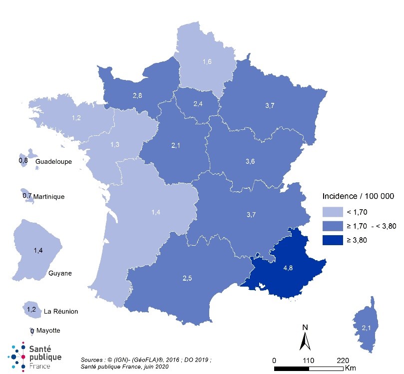 Des pics modérés ont été observés ponctuellement sans être en lien avec l'identification de cas groupés. Le taux d'incidence des cas notifiés en France métropolitaine (2,7/100 00) était supérieur à ceux des années précédentes excepté à celui de 2018.