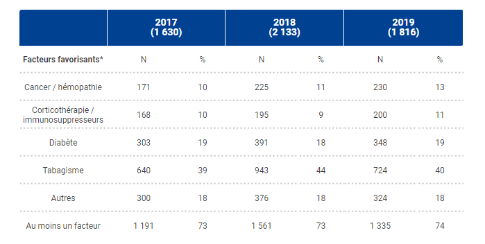 Tableau 1. Fréquence des facteurs favorisants des cas de légionellose notifiés en France, 2016-2019.