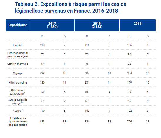 12 cas liés à un séjour dans un camping en Occitanie pour lesquels, les investigations épidémiologique, environnementale et microbiologique ont permis de préciser que l'eau du camping via les jacuzzis dans les bungalows et les installations sanitaires était la source la plus probable de contamination.