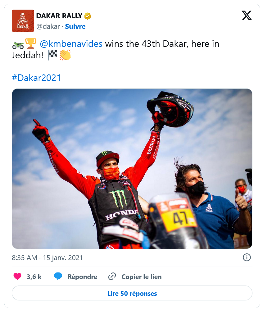 L'Argentin Kevin Benavides (Honda) a remporté vendredi le Dakar 2021 chez les motards, au terme de la 12e étape entre Yanbu et Jeddah. Cette dernière épreuve a été remportée par son coéquipier et Américain Ricky Brabec qui permet aussi à Honda de signer un doublé historique au classement général.