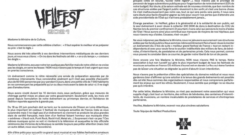 Si Roselyne Bachelot se dit confiante sur la tenue des festivals estivaux, il semblerait que les organisateurs du Hellfest ne le soient pas du tout. Dans leur lettre ils annoncent :