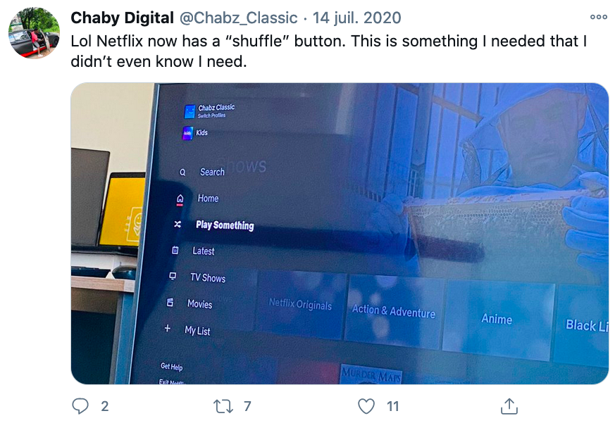 Lol Netflix dispose maintenant d'un bouton "Shuffle". C'est quelque chose dont j'avais besoin sans même le savoir.