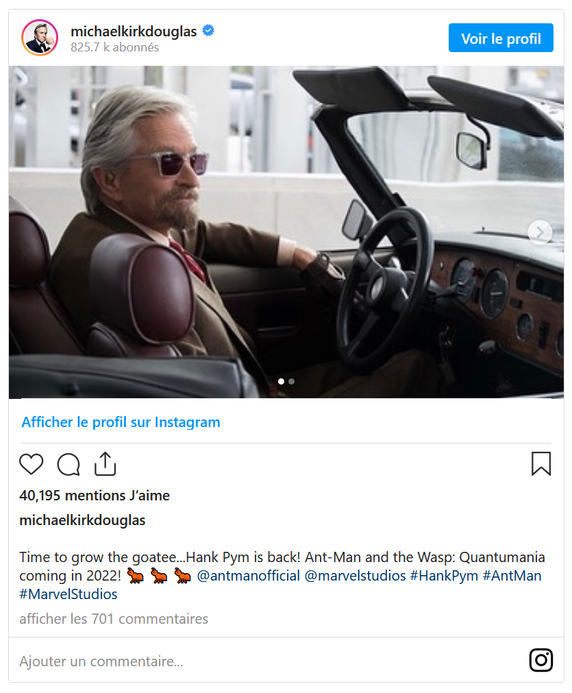 Comme vous pouvez le voir ci-dessus, Michael Douglas a annoncé en personne son retour dans le MCU dans le rôle de Hank Pym. Le fils de Kirk Douglas, qui était déjà présent dans les deux premiers Ant-Man et qui était apparu à l'enterrement de Tony Stark dans Avengers : Endgame, reprend du service. Pour le moment Michelle Pfeiffer n'a pas encore été confirmée dans le rôle de Janet van Dyne, mais il y a fort à parier que Ant-Man et la Guêpe : Quantumania explorera plus en profondeur la relation entre Hank et Janet et toute la période que Janet a passé dans le Monde Quantique.