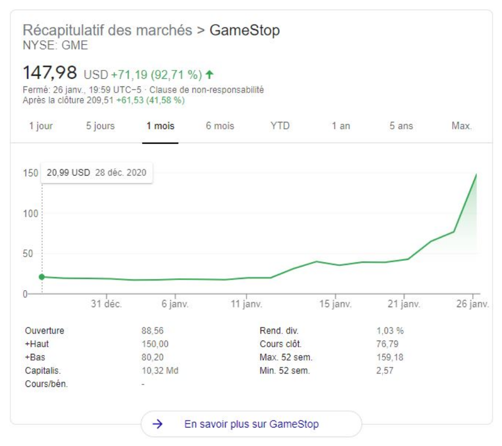 Pour y parvenir, ces derniers ont dû coordonner leurs actions. En peu de temps, un large groupe de personnes a acheté beaucoup d'actions GameStop. En agissant de la sorte, le subreddit a ainsi attiré des investisseurs réguliers, voyant simplement une action décoller et tentant de prendre le train en marche en vue d'un retour sur investissement rapide. Tout le monde voulant sa part du gâteau, l'action a littéralement gonflé encore et encore, d'autant que l'effet Reddit en a augmenté la visibilité. Cette hausse dans les volumes de transaction a permis à l'action de GameStop de faire de l'œil aux investisseurs, y voyant du concret. Une action gonflée qui redescendra forcément, tout ceci n'étant que spéculations. Vendredi dernier, l'action GameStop était la plus échangée sur le marché.