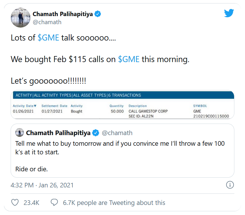 Ce mardi 26 janvier, Chamath Palihapitiya, CEO de Social Capital et propriétaire des Golden State Warriors de San Francisco, achetait notamment 50 000 actions à 115 dollars l'unité, faisant grimper de surcroît l'action. Le chaos règne, mais les investisseurs s'amusent. Elon Musk y a également eu un rôle à jouer en faisant grimper un peu plus l'action de GameStop en partageant un lien vers le subreddit sur son compte Twitter, dans un tweet qui aura récolté près de 140 000 likes. En agissant de la sorte, le subreddit souhaite titiller les platebandes de ceux pratiquant la vente à découvert. Si l'on en croit Business Insider, leurs pertes dépassent les 5 milliards de dollars. Le groupe compte bien réitérer avec d'autres entreprises cotées en bourse dans les mois à venir.