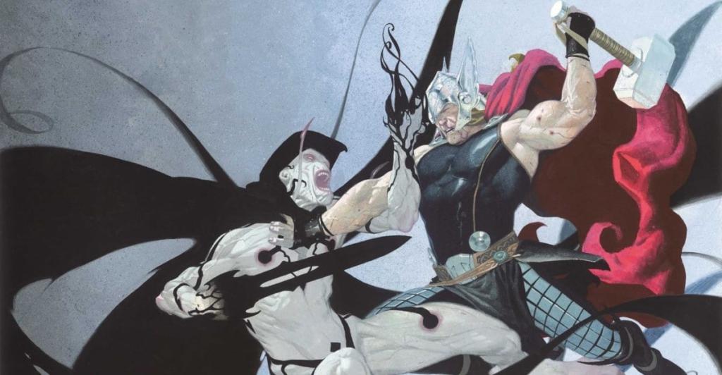 Pour comprendre le problème auquel se heurte le MCU pour Thor 4, il faut d'abord s'intéresser à l'histoire d'une arme nommée "All-Black The Necrosword" dans les comics. Le premier symbiote, dénommé "All-Black", s'est manifesté à partir de l'ombre de la divinité maléfique Knull. All-Black prend rapidement la forme d'une épée fabriquée à partir des ténèbres, et est maniée par Knull, ce qui lui a valu les surnoms de Necrosword et de Godslayer. Après que Knull ait été frappé d'incapacité lors d'une bataille contre un groupe de dieux puissants, All-Black l'a abandonné, et s'est lié à un extraterrestre appelé Gorr. Ce dernier a alors involontairement suivi les traces de Knull, utilisant sa nouvelle arme pour tuer des dieux à travers tout le cosmos, et gagner le titre de "Dieu Boucher".