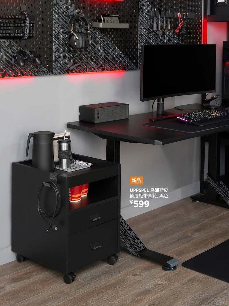 C'est le compte Twitter @momomo_us qui a publié en avant-première des photos des différents produits qu'Asus Rog et Ikea vont dévoiler prochainement. Il y a un petit caisson à roulette, une étagère, un bureau et une plaque à accrocher au mur pour y installer ses accessoires (casques, manettes, cordons...) comme celle que l'on peut retrouver dans les ateliers ou dans un garage.