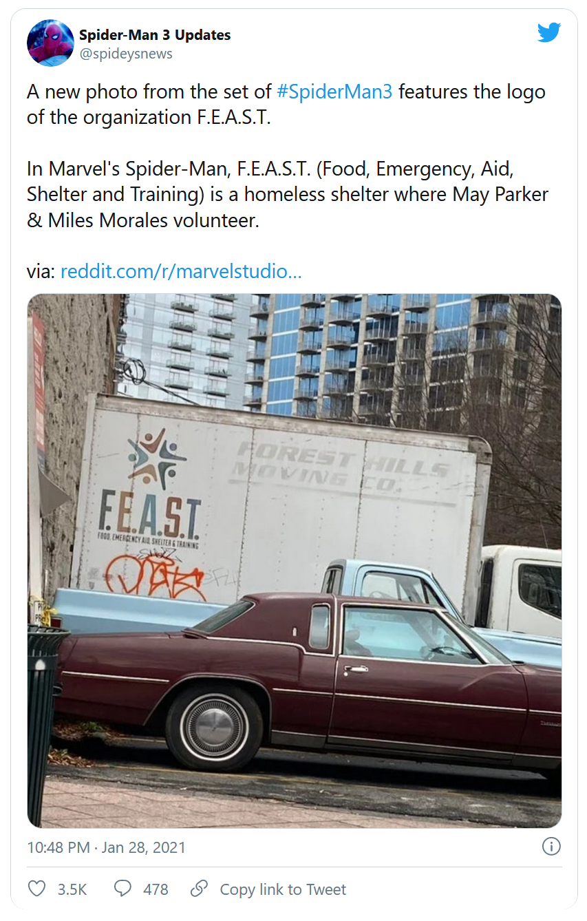 Mais ce qui a enflammé Internet récemment, c'est cette photo montrant un camion du F.E.A.S.T. (pour Food, Emergency, Aid, Shelter and Training). Si vous n'êtes pas à l'aise avec l'univers récent Spider-Man, il s'agit d'une organisation solidaire visant à donner de la nourriture aux plus démunis. Elle est notamment présente dans les jeux PS4 et PS5. Elles compte parmi ses bénévoles Tante May... et surtout Miles Morales !