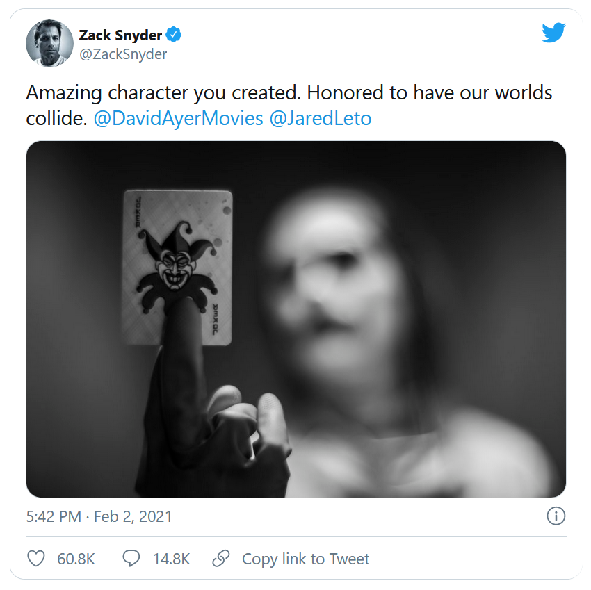 Zack Snyder, conscient des espoirs que cristallise sa version de Justice League, communique énormément sur ce grand événement cinématographique et télévisuel de l'année 2021. Le 2 février, le réalisateur de Watchmen et de Sucker Punch a partagé sur sa page Twitter une photo du Joker, qui laisse entendre qu'il aura un nouveau costume dans le Snyder Cut.