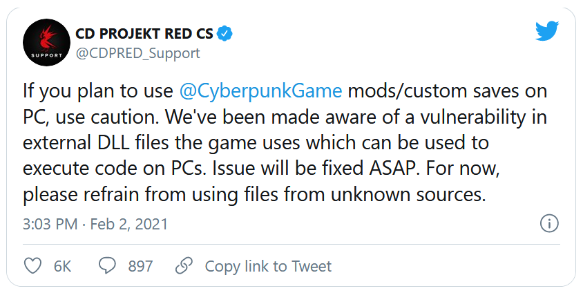 Mais récemment, les développeurs ont, via Twitter, fait part de leurs inquiétudes sur l'origine de certains de ces mods et ont invité les joueurs à vérifier les sources de ceux-ci. En effet, ils ont découvert l'existence d'une faille de sécurité permettant aux mods d'exécuter du code sur PC. Plus loin, ils expliquent que le problème sera réglé au plus vite. En attendant, mieux vaut éviter d'utiliser des fichiers de source inconnue.