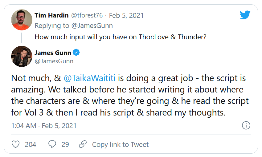 Il y a quelques jours, on apprenait que James Gunn était présent en Australie pour prêter main forte au réalisateur Taika Waititi. Aujourd'hui, il révèle sur Twitter qu'il est surtout là pour faire le pont avec Les Gardiens de Galaxie Vol.3. Un fan lui a demandé à quel point il était impliqué dans Thor : Love And Thunder.