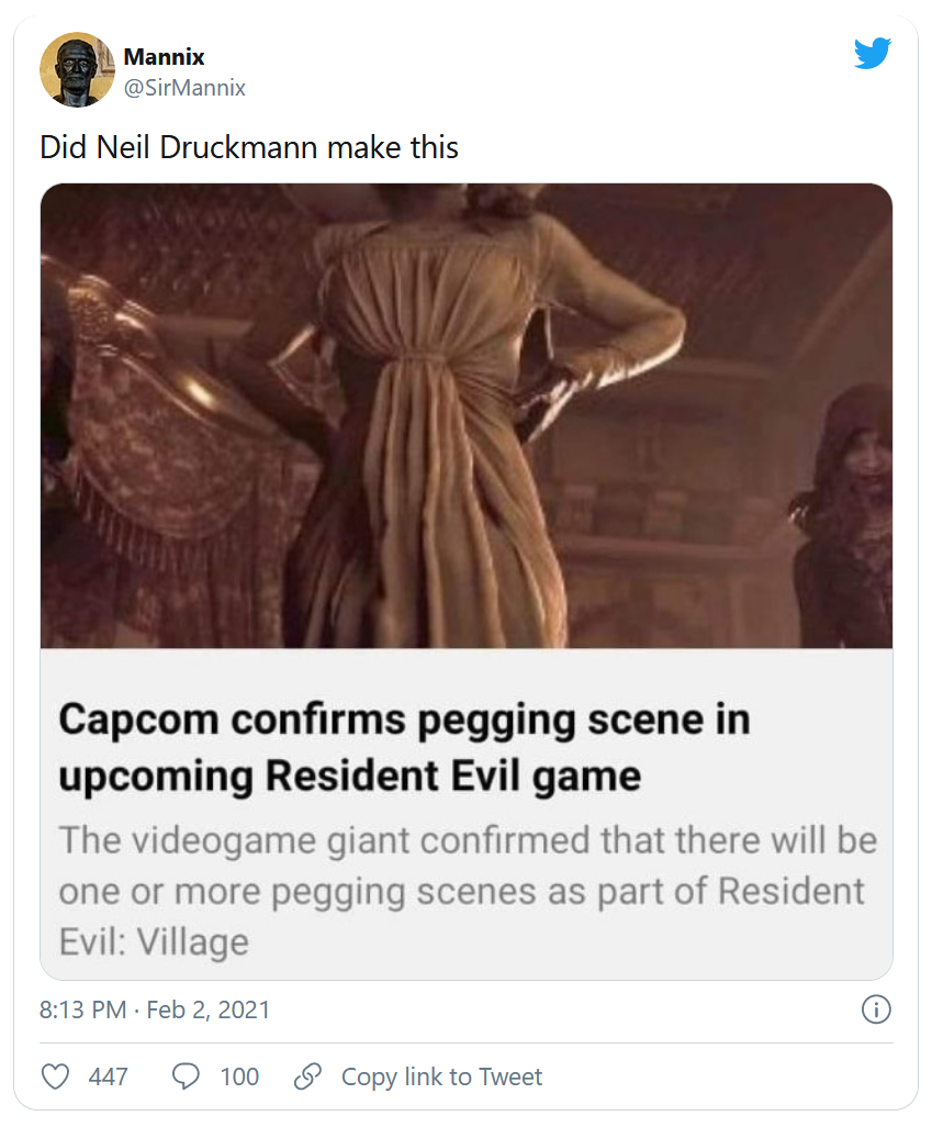 En effet, c'est sur Steam que la rumeur est partie, après que Capcom ait ajouté le tag "Sexual content" sur la page du jeu, à peu près au même moment où on a appris qu'il serait en open world. Ensuite, c'est un internaute qui a posté une capture d'écran d'un article web, non sourcé et non identifiable, expliquant qu'il y aurait des scènes de "pegging" dans Resident Evil Village (si vous ne savez pas ce que c'est, on vous invite à faire la recherche par vous-même.)