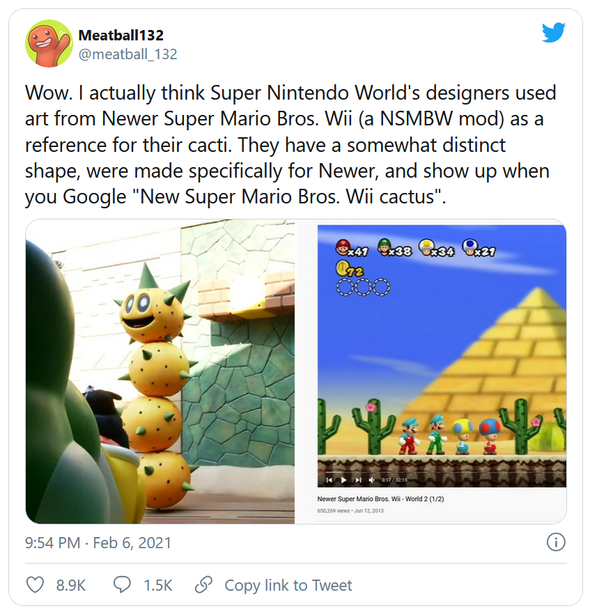 Depuis plusieurs mois maintenant, les internautes du monde entier peuvent découvrir semaine après semaine l'avancement du Super Nintendo World. Et même si son ouverture est décalée encore et encore à cause de la Covid-19, ce dernier continue de se dévoiler par petits bouts. Récemment, c'est l'un des décors du parc qui a dévoilé de sa superbe. Sur Twitter, un internaute du nom de Meatball132 a expliqué dans un tweet que les cactus du Super Nintendo World provenaient non pas d'un jeu officiel mais de Newer Super Mario Bros. Wii, un mod de New Super Mario Bros. Wii.