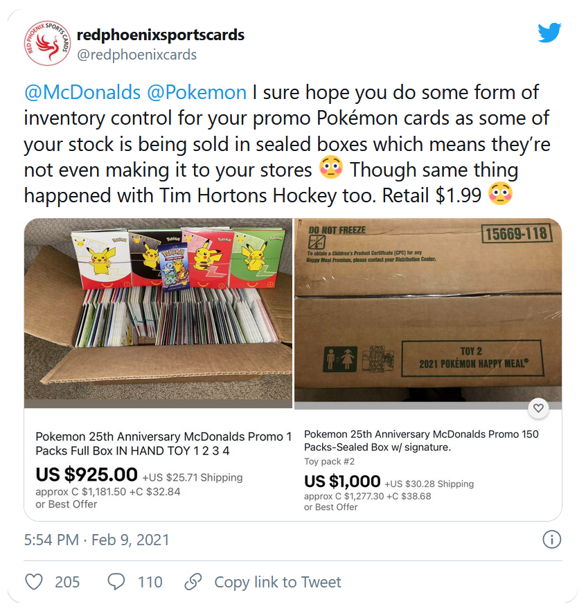 McDonald's et Pokémon, j'espère que vous ferez un contrôle d'inventaire pour vos cartes Pokémon promotionnelles, car une partie de votre stock est vendue dans des boîtes scellées, ce qui signifie qu'elles n'arrivent même pas dans vos magasins. Vente au détail 1,99 $.